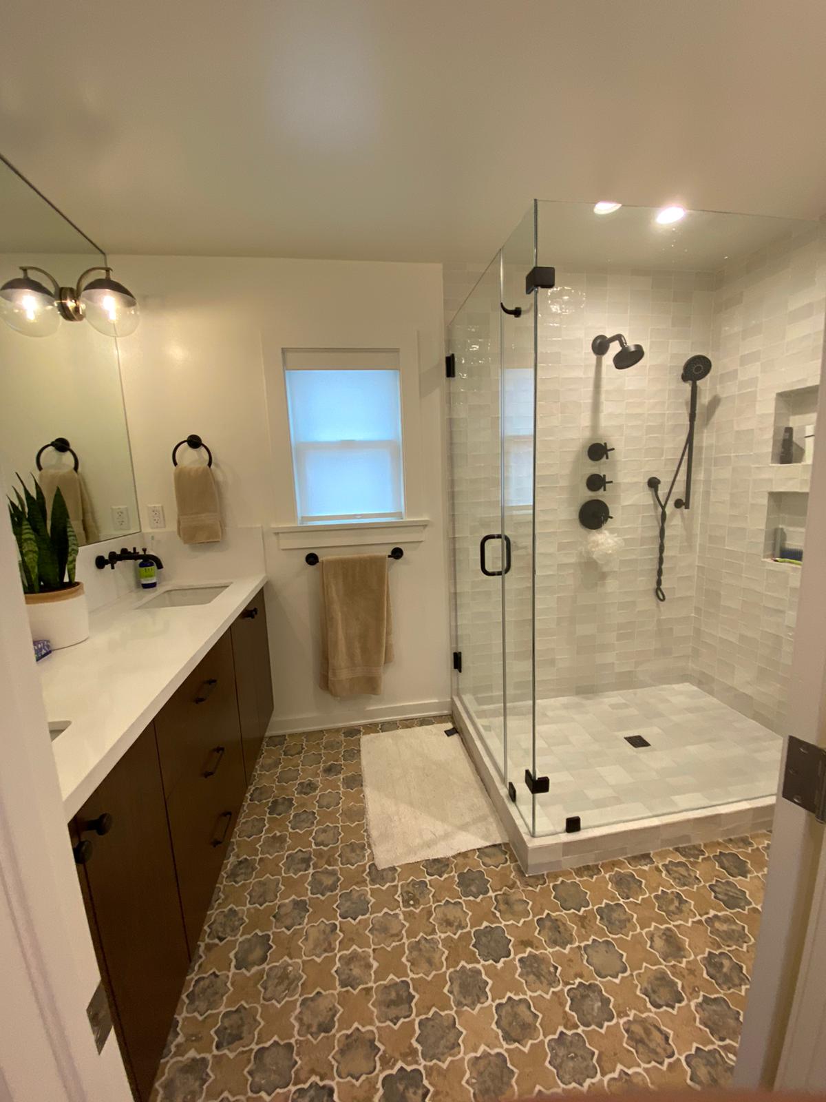 A bathroom remodel that seamlessly combines modern aesthetics with practical design features.