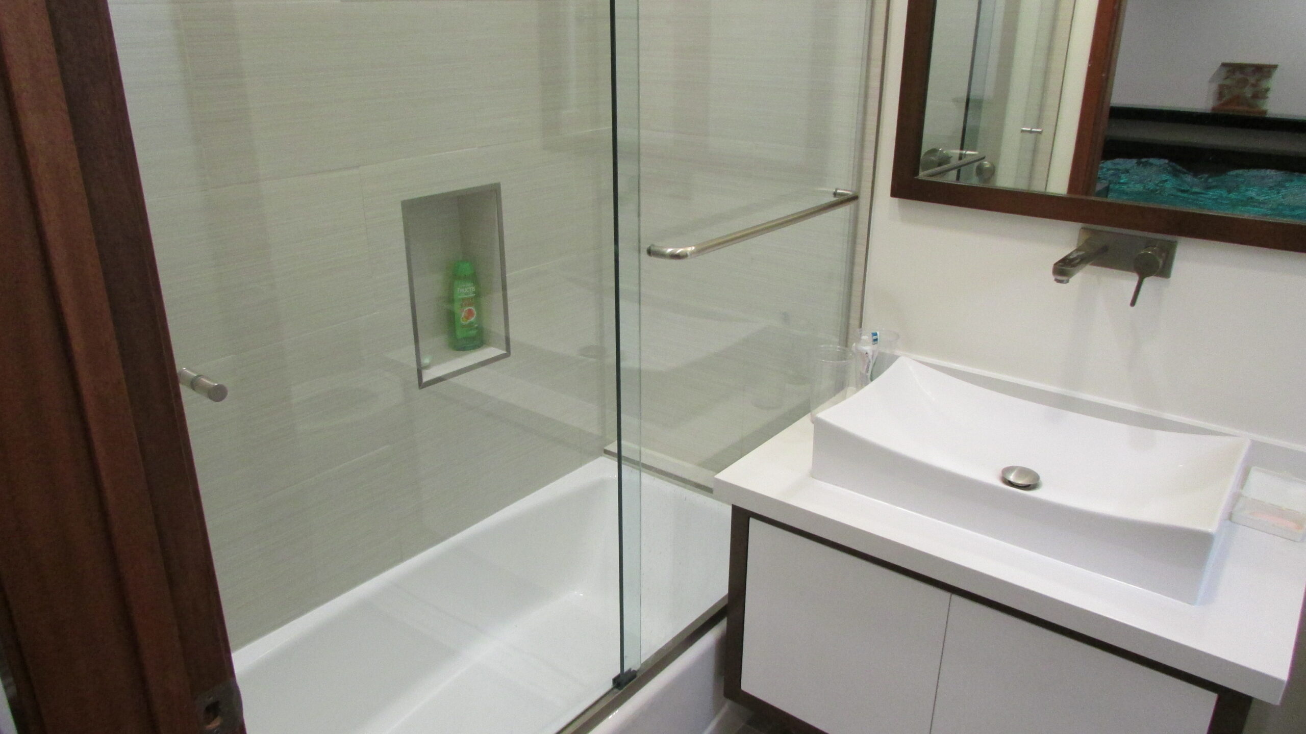 An innovative bathroom remodel that maximizes space while incorporating sleek and stylish elements.